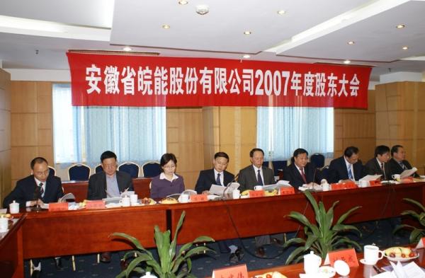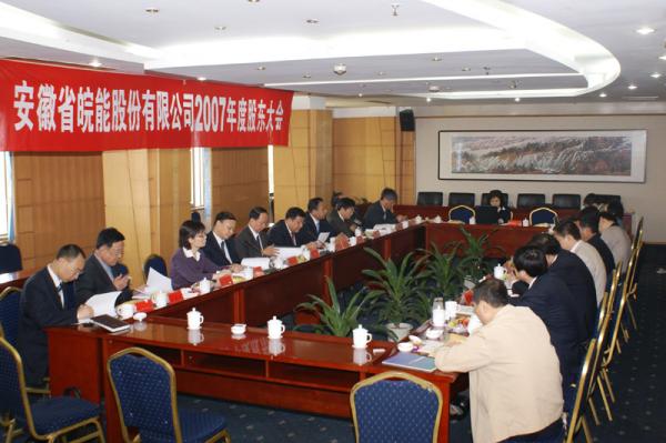 皖能電力2007年度股東大會于2008年4月29日上午九點(diǎn)在皖能大廈四樓五號會議室召開。出席會議的股東和股東代表6人,代表有效表決權(quán)509,308,704股,占公司現(xiàn)有總股本773,008,816股的65.89%。大會由董事會召集,董事長方平先生主持;公司董事會、監(jiān)事會和高管人員出席會議;會議安泰達(dá)律師事務(wù)所李榮律師現(xiàn)場見證。
