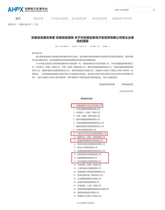 2月19日,安徽省發(fā)展改革委、省能源局發(fā)布通報,對安徽省售電(交易)公司及所屬四家子公司在推動煤電容量電價機(jī)制建設(shè)等方面的突出表現(xiàn)給予高度肯定和表揚。