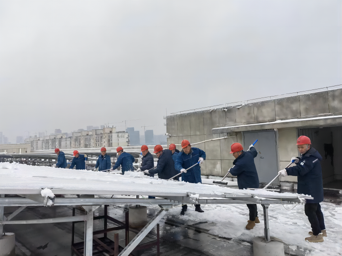 他們吃苦耐勞堅(jiān)韌不拔,不畏艱辛迎難而上。面對(duì)惡劣天氣影響,運(yùn)維組迅速響應(yīng),采取緊急措施保障電站的安全。2023年底、2024年初的幾場大雪,給各個(gè)光伏電站的運(yùn)營帶來了嚴(yán)重影響,運(yùn)維組成立應(yīng)急小組,制定《光伏電站積雪清理及節(jié)假日設(shè)備消缺應(yīng)急預(yù)案》,第一時(shí)間趕赴現(xiàn)場及時(shí)清除光伏組件積雪、排查安全隱患,積極應(yīng)對(duì)凍雨、暴雪天氣,確保極端天氣下電站設(shè)備安全穩(wěn)定運(yùn)行。